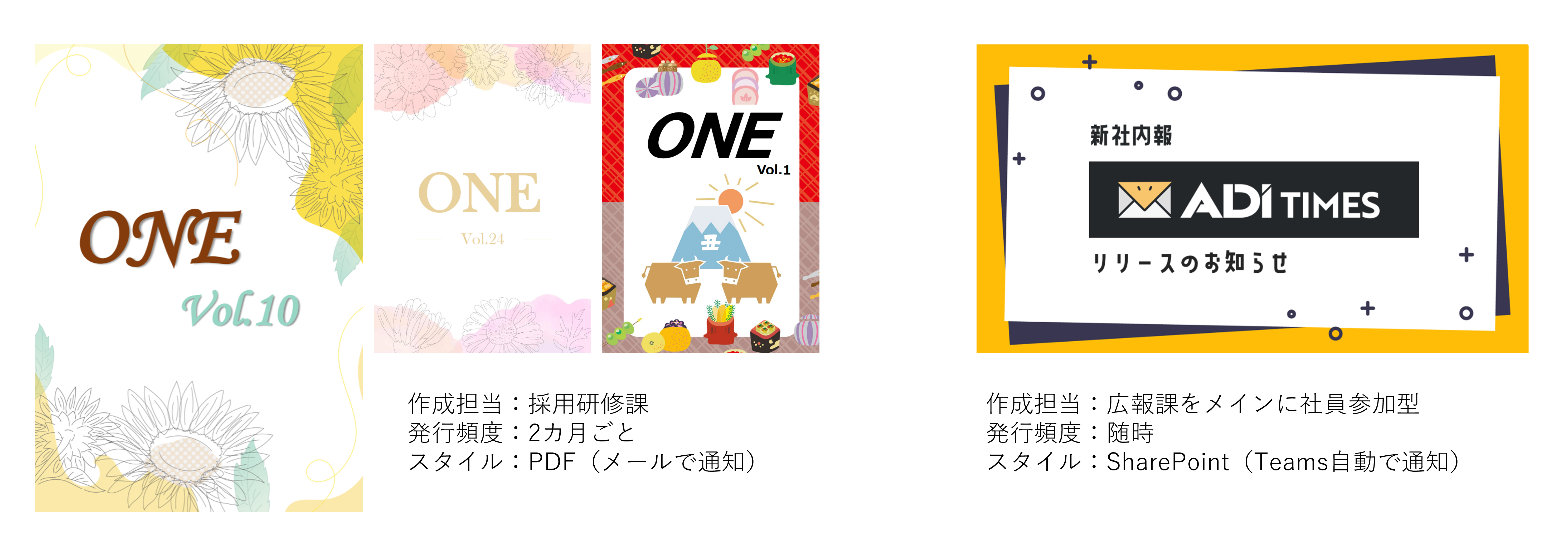 2025年2月より、ADIの新社内報「ADI Times(アディ タイムズ)」がスタートしました。 これまで採用研修課が中心となってPDF形式にて隔月発行していた社内報ONEを引き継ぎ、SharePointを活用した随時発行・更新が可能なスタイルへと移行。広報課を中心に、社員参加型の運営体制を構築しています。